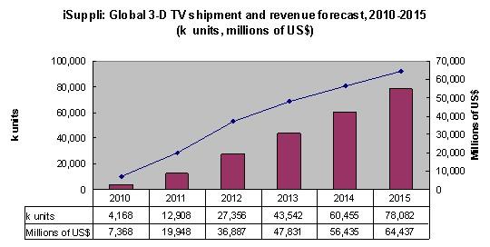市場調研公司DisplaySearch此前曾經預計,到2018年時3D電視規模將達到6,400萬。而另外一家調研公司iSuppli對3D電視的發展顯然更加樂觀,根據其最新報告,按照80%的年增長率計算,到2015年,3D電視的出貨量將從今年的420萬增長到7,800萬。