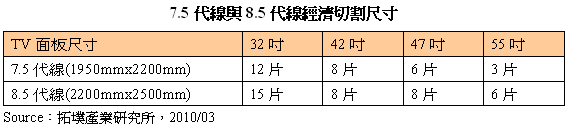 目前電視面板產線以7.5代與8.5代線為主,6代線產能則逐漸轉為Monitor面板生產。而7.5代線的經濟切割以42吋、47吋為主,8.5代線以55吋、47吋為主。若55吋需求強勁,7.5代線將不具生產優勢,而55吋需求降低,8.5代線又可生產55吋以下產品填補產能,所以8.5代線具有進可攻、退可守之優勢。
