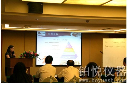 鉑悅儀器蘇總從公司的發展歷程、公司的人員組織構架、公司規模、售后服務、技術服務等方面來介紹鉑悅儀器,“自信、責任心、效率、勤奮、機智、信任”的企業文化,使鉑悅儀器憑借與世界各大儀器知名品牌的戰略合作關系,以及不斷優化公司自身經營管理,提高服務質量,成為中國國內知名的儀器供應商。并對參會人員表示衷心的感謝和熱烈的歡迎。