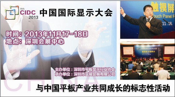 中國國際顯示大會(CIDC)是每年高交會必不可少的專業論壇。CIDC 2013將于11月17-18日在深圳會展中心盛大召開。本次論壇活動將邀請政府領導、面板及觸控廠商、設備及材料制造商、研究機構、專家學者等近500人共同討論FPD行業的技術趨勢和市場熱點。