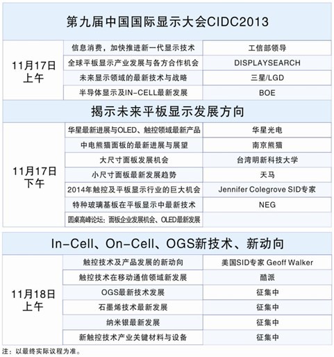 本屆CIDC大會為期兩天,京東方、華星光電、南京熊貓、天馬、NEG、酷派等行業上下游企業高層領導與技術精英將一一到會。其中特種玻璃基板、石墨烯、納米銀等最新觸控材料,In-cell、On-cell、OGS技術最新發展動向,將作為重點議題充分討論。