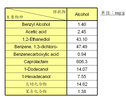 圖 5中有醋酸及Benzyl Alcohol。這兩個物種在前述的分析里都有出現,因此,比較不奇怪。比較有趣的,是Caprolactam,這個的量,相對而言,是比較高的。