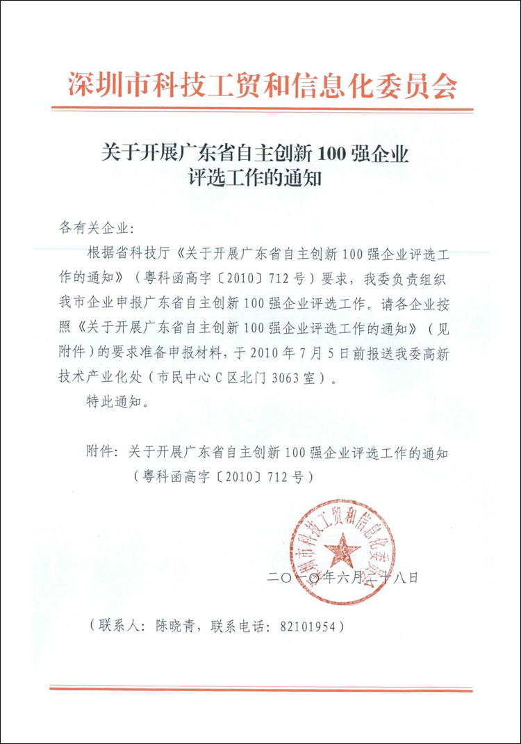 附件:關于開展廣東省自主創新100強企業評選工作的通知(粵科函高字[2010]712號)