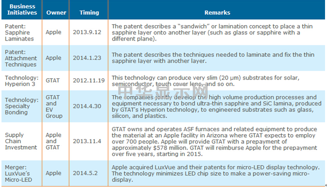 表一、蘋果和GTAT在藍寶石材料上的商業行動
