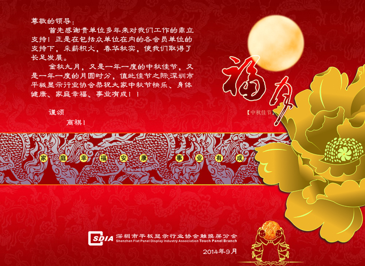 相識相知是緣分,合作日久見真誠,中秋佳節已來臨,深圳市平板顯示行業協會觸摸屏分會送上祝福表溫馨:祝福各會員單位好運相伴精神倍爽,人圓家圓事業美滿,中秋快樂安康!