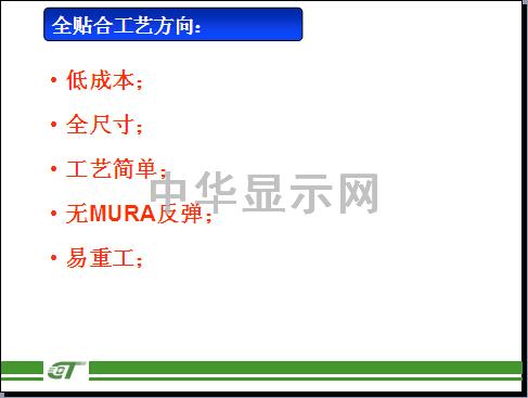 近日,深圳(zhen)平板顯(xian)示行業協會(hui)組織了(le)參觀易天自動(dong)化設備有(you)限(xian)公司(si)的(de)會(hui)員單(dan)位參觀活動(dong)。其中深圳(zhen)市中顯(xian)微電(dian)子有(you)限(xian)公司(si)副總裁(cai)姚伏恒發表(biao)了(le)《全貼合技(ji)術的(de)進展》的(de)演(yan)講報告。以下為其演(yan)講報告PPT部分內容(rong),詳情(qing)請關注中華顯(xian)示網與《國際光電(dian)與顯(xian)示》雜(za)志2015年2、3刊。
