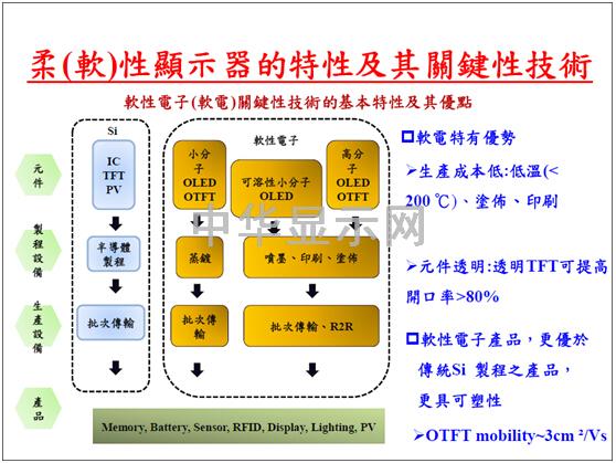 顧鴻壽教授介紹,OLED技術經過最近十年才慢慢發揚光大的,OLED柔性產品市場未來還將繼續擴大,并替代部分傳統顯示技術。他介紹柔性可分為兩類:一種是有液晶的,一種是沒有液晶的。而柔性不外乎就是要求得輕盈、柔軟、堅韌、薄型。柔性電子產品現在是有機的基板加上無機的材料,未來的發展一定是要找出有機的半導體材料,跟有機的基板貼在一起才能變成有機的可穿戴產品。