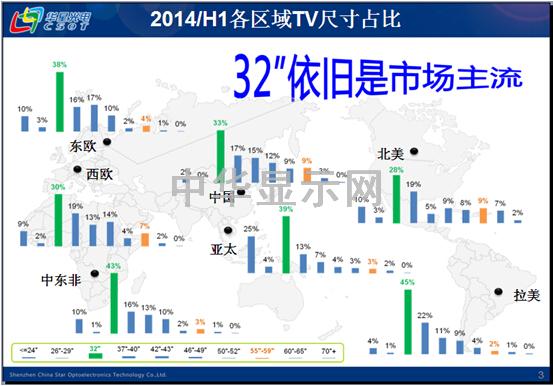 “2014年上半年不論是在東歐、西歐和中國大陸,北美、東非、亞太和拉美,32寸依然是市場主流,所以現在華星光電T1廠主要是生產32寸的液晶面板。亞太、中東和拉丁美洲32寸的占比非常大,但是在中國大陸和西歐、北美這些電視機發達的國家里面尺寸分布就比較平均。”華星光電研發中心產品開發副總監郭儀正在第十屆中國國際顯示大會上表示。