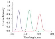 一般,以NTSC所規定的三角區域作為100%參比,色域覆蓋率大于92%則被稱為高色域顯示屏。對于高色域顯示屏來說,其基色光色坐標更加靠近光譜軌跡,色飽和度更高。圖3是典型的OLED以及QLED基色光的光譜,其光譜能量主要分布在紅、綠、藍波段且光譜較窄。不同于白光,基色光的亮度和顏色對于測量方法和設備均有很高的要求。