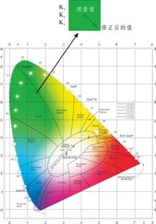 而一般商用色度計(彩色亮度計)的fx1', fy1'和fz1'遠遠大于3%,大到有些儀器制造商根本不標示光譜失匹配系數的值,這樣的儀器極大地影響了顯示屏品質的正確測量評估。雖然也有廠家針對彩色亮度計提出了一些修正方法,如圖7所示,通過一組標準色和測量值計算得到修正系數Kx、Ky、Kz,并以此來修正色度計的測量結果。但修正系數使用有限,測量顏色與標準色往往有差異,需要使用不同的修正系數,且每個顯示屏的三基色不可能完全相同,這就要求每次改變測量對象時都必須重新獲得修正系數,實際操作復雜,效率低下。