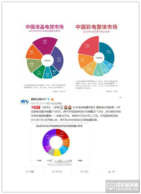 據媒體報道,奧維云網17日發布4月電視銷量快報,數據顯示,今年4月全國電視整體銷量374萬臺,其中樂視超級電視4月銷量達71萬臺,占19%,成為全行業全渠道銷量第一。創維46萬臺、海信45萬臺分列二三名。樂視超級電視自2013年7月3日開售以來,用不到3年時間成為月度絕對銷量冠軍。之后,中怡康也發布《2016年4月中國彩電整體市場品牌占有率》報告,雖然數字同奧維云網發布的報告有微小出入,也引起了相關競品的第一之爭,但最后依舊證實樂視超級電視4月總銷量位列全行業、全渠道第一。