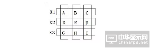實現兩點觸摸,每個工作單元必須彼此獨立,并且觸摸點只能在同一個工作單元中。圖1 給出了電阻式觸摸屏實現多點觸摸的方法:在X1 電極上加上電壓,由Y1,Y2,Y3 電極讀取A、B、C 觸摸單元所檢測到的X 坐標;在以后的各個始終周期依次讀取X2,X3 的坐標。獲得所有觸摸單元的X 坐標后,再依次給Y 電極加上電壓,以獲得各個觸摸單元的Y 坐標,從而實現兩點觸摸。