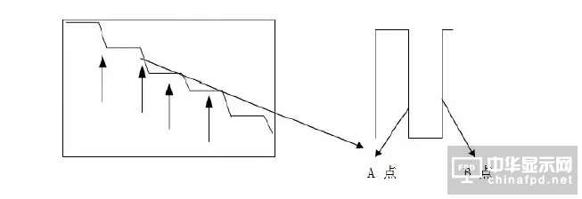 在進行測試畫線的過程中,電壓波形不是一條平滑的曲線,而是階梯波,因此在采樣過程中, 有可能在電壓上升沿或者下降沿采樣,這樣采樣得到兩個點之間的電壓,并不代表這個點是處于采樣得到的兩個點直線之間的任何一個點,而是如圖3 所示,折線上的A 點或者B 點。這樣會造成錯誤識別。在測試畫線的時候,如果畫線速度較快,第二次觸摸時電壓尚未穩定,會造成采樣時的誤讀,落在電壓變化的邊沿,采樣數據比A 點(下降沿)樣數據大,比B 點(上升沿)小。理論上來說,的確存在一個跟這個采樣數據對應的點,實際上選擇的這個點不是A 點,就是B 點。下面來分析一下造成這種現象可能的原因。