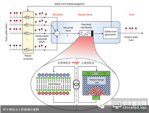 在人工神經元中,鍺銻碲薄膜起初是無定形態的。隨著信號的到達,薄膜逐漸變成結晶態,即逐漸變得導電。最終,電流通過薄膜,制造一個信號,并通過該神經元的輸出端發射出去。在一定的時間后,鍺銻碲薄膜恢復為無定形態。這個過程周而復始。