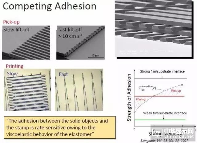 該技術可以通過改變打印頭的速度,選擇性地調整彈性印模和被轉移器件之間的黏附力,從而準確地控制裝配工藝。當印模移動較快時黏附力增大,從而使被轉移元件脫離源基板;相反地,當印模遠離鍵合界面且移動較慢時,黏附力變得很小,被打印元件便會脫離印模,然后被轉印在目標基板。