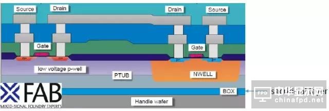 首先按照CMOS工藝標準,用光刻和刻蝕的工藝對SOI晶圓表面的單晶硅層進行圖形化,露出下面的Box層。然后對圖形化后的單晶硅進行封裝保護。用氫氟酸刻蝕去除器件下方的BOx層,在此過程中ILD和布線層受到保護而不會損傷。