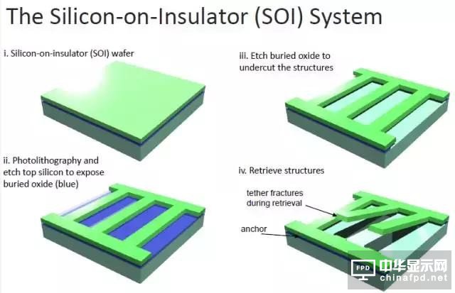 絕緣體上硅(SOI)晶圓的結構是在一層1微米厚的氧化層(Box: Barrier Oxide)上面制備一層5微米厚的單晶硅層。然后在單晶硅層上面采用標準SOI晶體管加工工藝制備各種器件和集成電路。不難看出SOI晶圓的氧化層可以作為天然的犧牲層,所以它將會是一種非常方便、隨時可用的“源”晶圓。