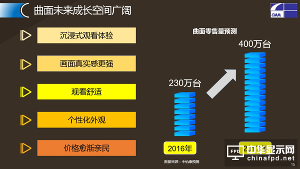 正是基于這樣的背景,曲面屏開始在2016年井噴。根據中怡康時代市場研究的數據顯示,2016年國內的曲面顯示器預計出貨量可達200萬臺,到了2017年則將達到500萬臺。而且在高端網吧新增顯示器中曲面高達70%,并且以30英寸為主,更傾向于低曲率的曲面顯示器。高端網吧(網咖)主要服務較高層次的游戲玩家,他們對于游戲的體驗要求更高。這被認為是網吧管理者與玩家之間共同對曲面顯示器產生了“高端”的認可,即便它們使用的曲面顯示器也未必會比高端平面顯示器的價格更貴。