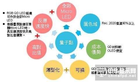 量(liang)(liang)子(zi)點(QD) TV為三星在高階機種主力發展技術,主要與OLED TV相(xiang)抗衡;量(liang)(liang)子(zi)點材料于顯示器中明顯優勢是可達(da)到高色飽和(he)度,未(wei)來三星所量(liang)(liang)產(chan)的QLED顯示器屬自發光型式,故結構更為簡單(dan),與OLED相(xiang)較,將(jiang)具(ju)成本低(di)、壽命長(chang)等優勢。至于業界高度關注的Micro LED,DIGITIMES Research認(ren)為若(ruo)搭配量(liang)(liang)子(zi)點材料,則較其(qi)它結構及制程(cheng)有機會達(da)全彩(cai)化,然(ran)量(liang)(liang)產(chan)時程(cheng)仍(reng)尚未(wei)確定。