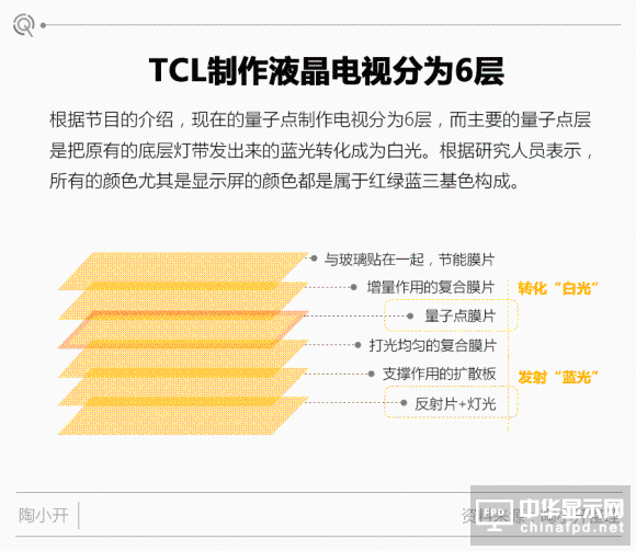 節目特別(bie)下到工廠(chang)對(dui)量子(zi)(zi)點(dian)液晶電視(shi)和(he)普通液晶電視(shi)做了對(dui)比,普通的(de)(de)(de)有(you)機液晶電視(shi)發(fa)光(guang)材(cai)料只能(neng)達到70左右,而量子(zi)(zi)點(dian)技術能(neng)夠達到100-110。液晶電視(shi)分為(wei)6層(ceng),最(zui)低(di)層(ceng)是(shi)屬于(yu)發(fa)射(she)(she)片(pian)(pian)和(he)燈(deng)條(tiao)(tiao),然后再是(shi)支(zhi)撐作用的(de)(de)(de)擴散板,接著(zhu)是(shi)打光(guang)均(jun)勻的(de)(de)(de)復(fu)合膜片(pian)(pian),再就是(shi)我(wo)們(men)的(de)(de)(de)量子(zi)(zi)點(dian)膜片(pian)(pian),它能(neng)夠把最(zui)底層(ceng)燈(deng)條(tiao)(tiao)發(fa)射(she)(she)出來的(de)(de)(de)藍光(guang)轉化成為(wei)白光(guang);再接著(zhu)是(shi)增量作用的(de)(de)(de)復(fu)合膜片(pian)(pian)以(yi)及與玻璃貼在一起,起節能(neng)效果的(de)(de)(de)膜片(pian)(pian)。