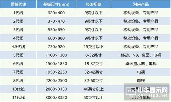 顯示面板(ban)代線和玻璃基板(ban)尺寸及終端產(chan)品(pin)對應情況(kuang)