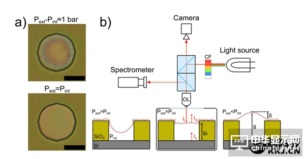 石墨(mo)烯(xi)(xi)原本(ben)是透明(ming)的,太薄(bo)了根本(ben)不會(hui)反射(she)光線,但這里使用了雙層石墨(mo)烯(xi)(xi)。隨著石墨(mo)烯(xi)(xi)氣泡(pao)膨脹(zhang)或者收縮,光線透過時部分被吸收,剩下的被反射(she)回來(lai),就形成(cheng)了不同的顏色。