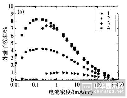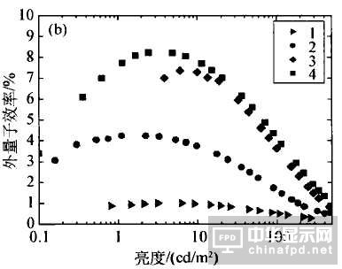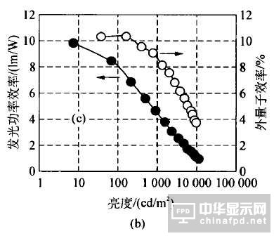當(dang)摻雜物質量分數是(shi)(shi)21%器件(jian)最高(gao)達180o<r}p最高(gao)25 lm="" w)。很難得的是(shi)(shi)此(ci)器件(jian)只(zhi)有(you)(you)輕微(wei)的“效率滾降”現象,在1000="" cd="" m2照明(ming)亮度(du)下?ext="" 幾乎(hu)沒有(you)(you)改變(bian),?p只(zhi)略(lve)微(wei)下降至22="" w(見圖4一(yi)25)。即(ji)使到(dao)10000="" mz的超(chao)高(gao)照明(ming)亮度(du)(電流密度(du)不(bu)到(dao)10="" ma="" cm2),}p仍有(you)(you)15="" w。