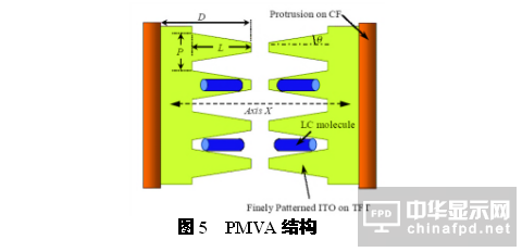 1998年,三星公司(si)提出了PVA的結構(gou),如(ru)圖3所示,是在(zai)(zai)陣列(lie)和(he)彩膜(mo)基(ji)板(ban)(ban)(ban)的像素電(dian)極ITO上刻出溝槽。在(zai)(zai)初始狀(zhuang)態時,液晶分子垂直于(yu)基(ji)板(ban)(ban)(ban)表(biao)面排列(lie),當施加電(dian)壓以后(hou),液晶分子沿著電(dian)場線(xian)的方向進行(xing)排列(lie)。效果等同于(yu)富士(shi)通(tong)的MVA結構(gou)。圖4結構(gou)在(zai)(zai)2008年以前被廣泛專利授(shou)權使用,即在(zai)(zai)彩膜(mo)基(ji)板(ban)(ban)(ban)上做出凸(tu)起,在(zai)(zai)陣列(lie)基(ji)板(ban)(ban)(ban)上對ITO像素電(dian)極進行(xing)刻蝕,這種結構(gou)對面板(ban)(ban)(ban)廠來說(shuo),設計相對簡單(dan),生產成本(ben)低且良(liang)率(lv)比較有保(bao)證(zheng)。