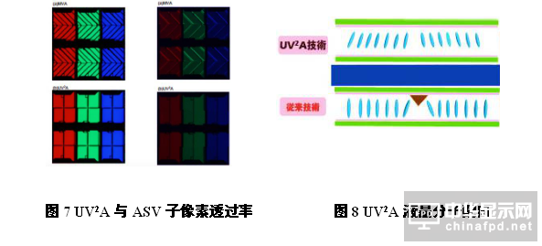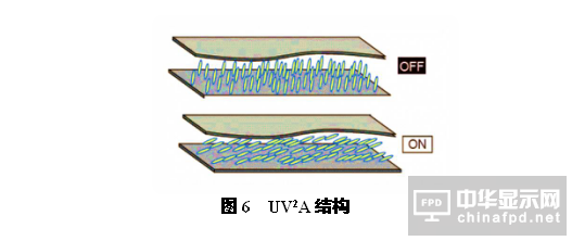 在2006年,日本夏普提出(chu)并開發了UV2A的顯示技術,如圖6所(suo)示,使用光配(pei)向(xiang)技術,對(dui)彩膜和陣(zhen)列(lie)(lie)基板兩側的配(pei)向(xiang)膜進行紫外光配(pei)向(xiang),形成多(duo)疇(chou)結構。初始狀態時(shi),液晶(jing)分子(zi)(zi)以一定角(jiao)(jiao)度排列(lie)(lie),當施加(jia)電(dian)壓以后,液晶(jing)分子(zi)(zi)會按配(pei)向(xiang)的角(jiao)(jiao)度進行轉動,從而使光線從液晶(jing)面(mian)板中透過。