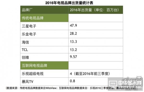 但實際上,從整個電視行業放眼,互聯網電視占據的市場僅僅只是很小的一部分。下表數據可以看出,互聯網電視品牌的年出貨量與三星、LG、海信等傳統電視品牌相比,互聯網電視整體出貨量并沒有想象中大。