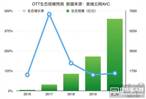 從無人從業到相繼試水再到現在的戰況焦灼,整個互聯網電視規模繼續擴大,但不同于手機等電子產品的快速迭代換新,電視機在家庭中存在時間相對更長,傳統電視換互聯網電視的新增用戶紅利在近幾年內只有一次機會。根據奧維云網的數據預測,OTT(互聯網電視+盒子)生態規模增長率會在2017年迎來高峰,隨后增長速度減緩。