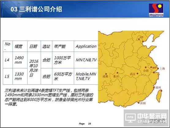 據介紹(shao),三(san)(san)利(li)譜光(guang)(guang)電(dian)從2004年(nian)(nian)就開(kai)始研發生(sheng)產(chan)(chan)(chan)偏(pian)光(guang)(guang)片(pian)(pian),是(shi)國(guo)(guo)內領先(xian)的偏(pian)光(guang)(guang)片(pian)(pian)解決方案供應(ying)商。目(mu)前(qian)(qian)三(san)(san)利(li)譜光(guang)(guang)電(dian)有(you)四(si)個工廠,第一(yi)個是(shi)深圳(zhen)松(song)崗的1330mm中后工序生(sheng)產(chan)(chan)(chan)線(xian);第二個是(shi)福建650mm偏(pian)光(guang)(guang)片(pian)(pian)產(chan)(chan)(chan)線(xian),產(chan)(chan)(chan)能120萬㎡/年(nian)(nian);第三(san)(san)個是(shi)深圳(zhen)光(guang)(guang)明新(xin)(xin)區的國(guo)(guo)內首條1490mm寬幅(fu)TFT偏(pian)光(guang)(guang)片(pian)(pian)全制程(cheng)生(sheng)產(chan)(chan)(chan)線(xian),產(chan)(chan)(chan)能600萬㎡/年(nian)(nian);第四(si)個是(shi)2016年(nian)(nian)10月(yue)28日在合肥新(xin)(xin)建的工廠,包(bao)括兩(liang)條線(xian):一(yi)條為1490mm,一(yi)條為1330mm。目(mu)前(qian)(qian)三(san)(san)利(li)譜光(guang)(guang)電(dian)產(chan)(chan)(chan)品(pin)種類豐富(fu),涵蓋(gai)應(ying)用于手(shou)機、家用電(dian)器(qi)顯(xian)示(shi)(shi)屏(ping)、遙(yao)控器(qi)顯(xian)示(shi)(shi)屏(ping)的黑(hei)白偏(pian)光(guang)(guang)片(pian)(pian)、3D偏(pian)光(guang)(guang)片(pian)(pian)、OLED偏(pian)光(guang)(guang)片(pian)(pian)。未來三(san)(san)利(li)譜光(guang)(guang)電(dian)還將持(chi)續(xu)加大偏(pian)光(guang)(guang)片(pian)(pian)投入,未來計劃建四(si)條寬幅(fu)TFT生(sheng)產(chan)(chan)(chan)線(xian),屆(jie)時產(chan)(chan)(chan)能達到(dao)8000萬平方米/年(nian)(nian),躋身全球第一(yi)陣營。