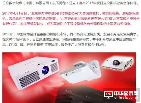 2015年3月,日立投影渠道結束了與鴻合的黃金10年,進入三國狀態。即,東方中原作為液晶工程投影機和全系列商務投影機中國總代理;北京瑞事達作為全系列教育投影機中國總代理;天創數碼集團作為DLP工程投影機中國總代理。這標志著日立開始尋求作為品牌商更多的話語權,以及日立投影機“技術市場”細分戰略的展開。