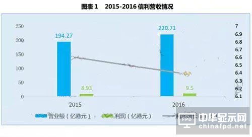 2016年信利營業收入達到220.71億港元,同比增長13.6%;利潤值為9.50億港元,同比增長6.4%。歷年保持一定的利潤增長使得信利成功入選2016年福布斯亞洲上市公司50強。