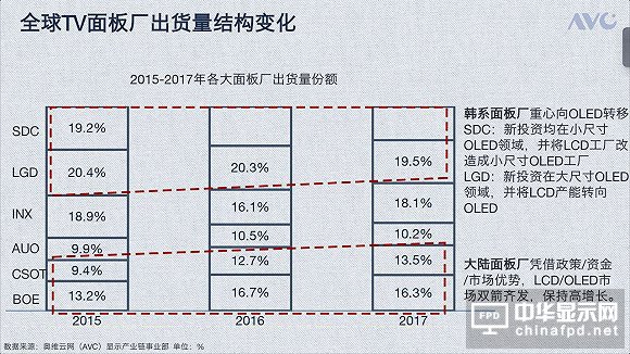 從第三方權威大數據公司奧維云網提供的數據看,中國大陸、中國臺灣和日韓的液晶面板產量,已形成三足鼎立之勢,三家的份額都維持在30%左右。而且在產品質量、可靠性方面,均沒有太大的差異了。