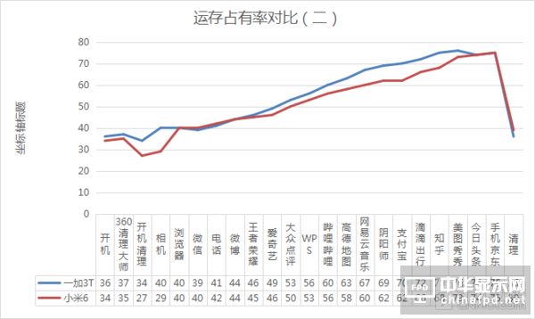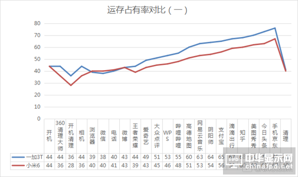 測試方法簡單粗暴,一加3T和小米6依次打開20款應用,觀察其運存的占用率,運存占用率一定程度上可以反映出廠商的運存調教機制,以及當前的系統流暢度。