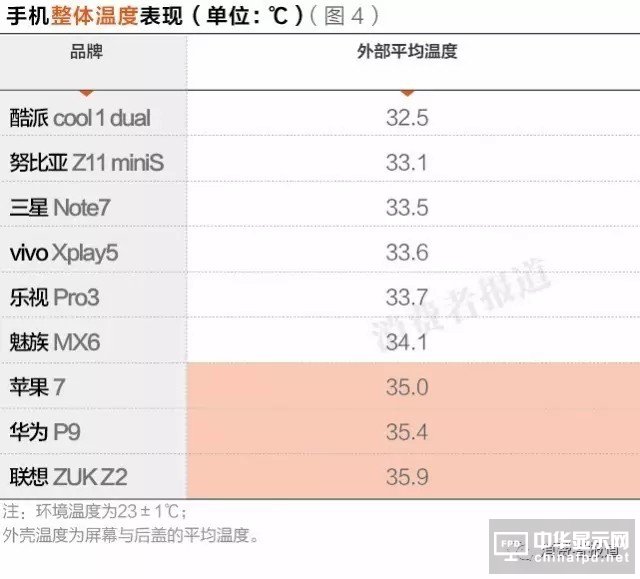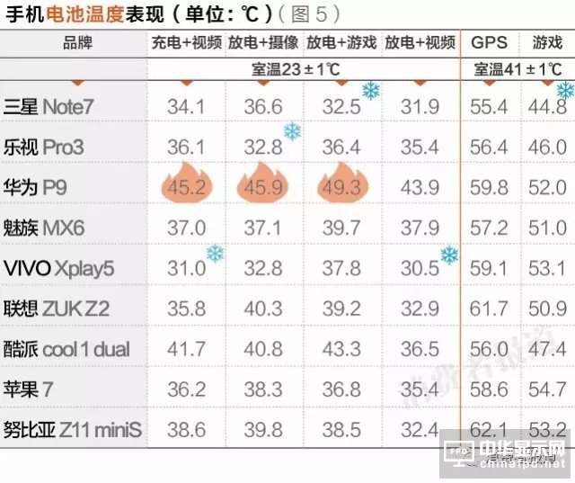 在“放電+游戲”環節,最高的華為P9(49.3℃)與最低的三星Note7(31.9℃)竟相差了17.4℃,這個溫度差距十分明顯。