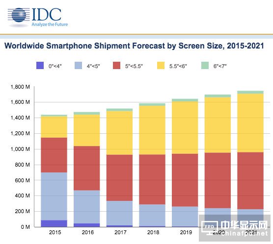 IDC預計,絕大多數智能手機市場,將由5-5.5英寸(不含)和5.5-6英寸(不含)機型“平分天下”,它們的出貨量將由今年的5.933億部和5.587億部,分別增長至2021年的7.314億部和7.493億部。