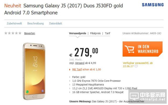 盡管三星尚未正式發布New J系列新機,但此前已有真機亮相的三星GALAXY J5(2017)現在已經登陸德國在線銷售商Cyberport網站,并給出了6月22日開賣的消息。盡管現在還不能百分百確定這將是三星New J系列在歐洲的發售時間,但相信應該不會離的太遠,也就是也將在本月底登陸歐洲市場。