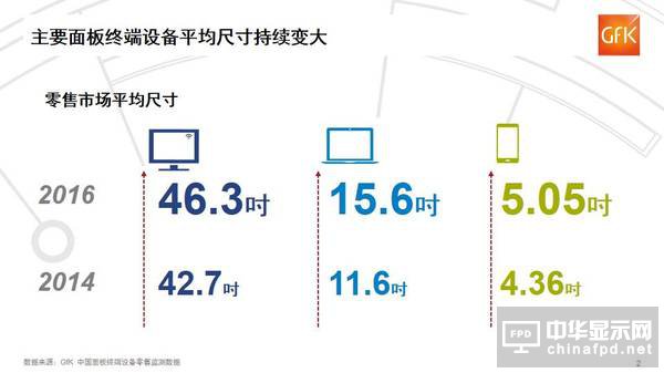 GfK數據顯示,截止2016年,中國電視、IT產品和智能手機的平均尺寸持續增長,其中IT產品平均尺寸提升最快,兩年內提升了4吋至15.6吋,電視機平均尺寸則最大達46.3吋,手機平均尺寸亦突破了5吋。