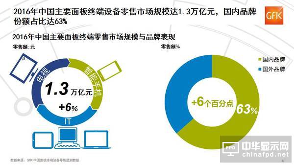 GfK數據顯示,截止至2016年,中國主要面板終端設備的零售規模達1.3萬億人民幣,同比增長6%.