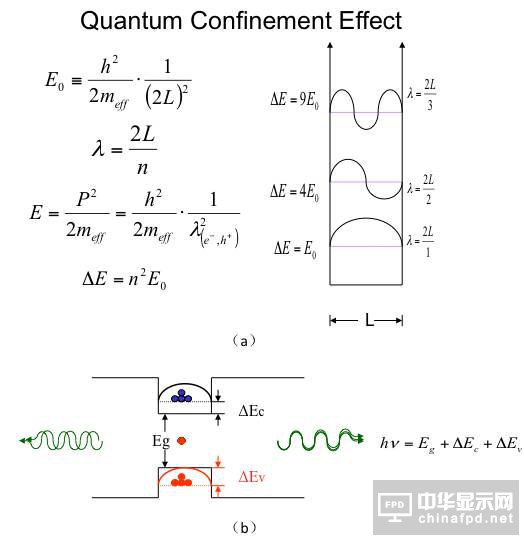 在(zai)微觀世(shi)界(jie)里,尤其(qi)是在(zai)納(na)(na)米(mi)尺度(du)之下,所(suo)有的(de)(de)(de)(de)光與(yu)電(dian)(dian)的(de)(de)(de)(de)現象,都會(hui)(hui)與(yu)我(wo)們看(kan)到的(de)(de)(de)(de)大(da)尺度(du)世(shi)界(jie)那么(me)的(de)(de)(de)(de)不(bu)(bu)同,如圖(tu)二(er)(a)所(suo)示(公式(shi)看(kan)不(bu)(bu)懂可以跳過去),根據薛定(ding)諤方程式(shi)波函數的(de)(de)(de)(de)解,在(zai)量(liang)(liang)(liang)子(zi)(zi)尺度(du)(L)下,尺度(du)的(de)(de)(de)(de)不(bu)(bu)同,電(dian)(dian)子(zi)(zi)與(yu)空穴(xue)所(suo)處的(de)(de)(de)(de)能(neng)量(liang)(liang)(liang)狀(zhuang)態(tai)(tai)△E也(ye)會(hui)(hui)不(bu)(bu)同,也(ye)許它(ta)會(hui)(hui)在(zai)能(neng)級Eo的(de)(de)(de)(de)位置,也(ye)許會(hui)(hui)在(zai)4Eo的(de)(de)(de)(de)位置,也(ye)許在(zai)9Eo或16Eo…..,因(yin)為物理尺寸的(de)(de)(de)(de)不(bu)(bu)同,材(cai)料(liao)中電(dian)(dian)子(zi)(zi)的(de)(de)(de)(de)能(neng)級也(ye)會(hui)(hui)相應(ying)的(de)(de)(de)(de)變(bian)(bian)(bian)化,所(suo)呈現的(de)(de)(de)(de)材(cai)料(liao)特性(xing)就(jiu)會(hui)(hui)與(yu)原本的(de)(de)(de)(de)材(cai)料(liao)本性(xing)差異極大(da),如圖(tu)二(er)(b)所(suo)示,此時發(fa)(fa)光的(de)(de)(de)(de)能(neng)量(liang)(liang)(liang)或頻率就(jiu)不(bu)(bu)再(zai)是材(cai)料(liao)本身的(de)(de)(de)(de)能(neng)帶隙(xi)性(xing)質Eg,而是帶隙(xi)較寬的(de)(de)(de)(de)(Eg+△Ec+△Ev),能(neng)量(liang)(liang)(liang)變(bian)(bian)(bian)強發(fa)(fa)光波長因(yin)此會(hui)(hui)變(bian)(bian)(bian)短,這樣(yang)因(yin)為電(dian)(dian)子(zi)(zi)與(yu)空穴(xue)被局(ju)限在(zai)納(na)(na)米(mi)材(cai)料(liao)內形成(cheng)自組的(de)(de)(de)(de)穩(wen)定(ding)態(tai)(tai),造成(cheng)光電(dian)(dian)性(xing)質的(de)(de)(de)(de)改變(bian)(bian)(bian),這樣(yang)的(de)(de)(de)(de)效應(ying)我(wo)們稱為量(liang)(liang)(liang)子(zi)(zi)局(ju)限效應(ying)。