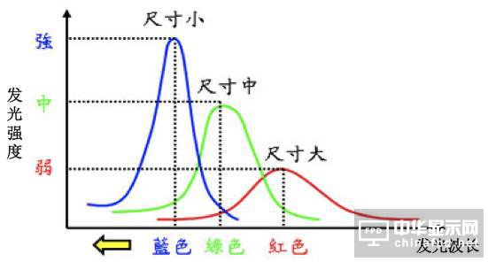 如(ru)圖三所示,不(bu)同(tong)顏(yan)色(se)(se)(se)的(de)(de)(de)(de)光(guang)(guang)(guang)(guang)波(bo)長(chang)(chang)(chang)不(bu)同(tong),光(guang)(guang)(guang)(guang)的(de)(de)(de)(de)波(bo)長(chang)(chang)(chang)就是顏(yan)色(se)(se)(se),在可(ke)見光(guang)(guang)(guang)(guang)中紅光(guang)(guang)(guang)(guang)的(de)(de)(de)(de)波(bo)長(chang)(chang)(chang)最(zui)長(chang)(chang)(chang),綠光(guang)(guang)(guang)(guang)次之,藍光(guang)(guang)(guang)(guang)最(zui)短,換句話說,當納米材(cai)料的(de)(de)(de)(de)尺(chi)寸大,發(fa)(fa)光(guang)(guang)(guang)(guang)的(de)(de)(de)(de)能(neng)量(liang)(liang)(liang)較(jiao)低,顏(yan)色(se)(se)(se)為紅光(guang)(guang)(guang)(guang)(波(bo)長(chang)(chang)(chang)最(zui)長(chang)(chang)(chang));當納米材(cai)料的(de)(de)(de)(de)尺(chi)寸變(bian)小,發(fa)(fa)光(guang)(guang)(guang)(guang)能(neng)量(liang)(liang)(liang)變(bian)強(qiang),顏(yan)色(se)(se)(se)為綠光(guang)(guang)(guang)(guang)(波(bo)長(chang)(chang)(chang)次之);當納米材(cai)料的(de)(de)(de)(de)尺(chi)寸更小,發(fa)(fa)光(guang)(guang)(guang)(guang)能(neng)量(liang)(liang)(liang)更強(qiang),顏(yan)色(se)(se)(se)為藍光(guang)(guang)(guang)(guang)(波(bo)長(chang)(chang)(chang)最(zui)短)。