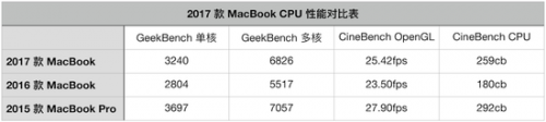 從結果看,2017 款 MacBook 的 CPU 性能在不同的測試中的提升幅度高達 16%——44%,各項數據直逼 2015 款 MacBook Pro 的酷睿 i5。