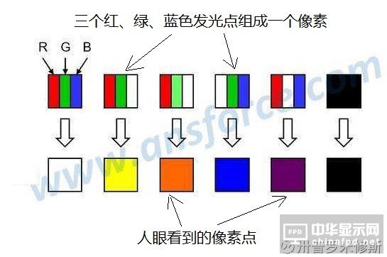 在顯(xian)示屏幕上的所有顏色(se),都由這紅色(se)、綠色(se)、藍色(se)三種色(se)光按(an)照不同的比例混合而成的。一(yi)組紅色(se)、綠色(se)、藍色(se)就(jiu)是一(yi)個(ge)最小的顯(xian)示單位。紅、綠、藍色(se)又(you)稱為三原色(se)光。