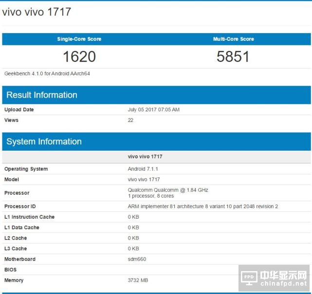 此次出現在知名跑分網站Geekbench的vivo 1717在配置上并沒有特別的地方,預裝的是Android7.1.1系統,并擁有4GB內存,搭載的是1.84GHz主頻的驍龍660處理器,但單核和多核的跑分成績分別達到了1620和5851,不僅超越了擁有同款處理器的vivo TD1608的表現,而且在所有vivo手機的跑分排名中更是高居榜首。