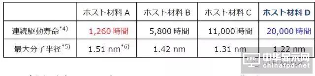 文章中四個對照組響(xiang)應的Host材料分子(ホスト材料)半徑和(he)器件壽命(ming)