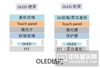 硬屏OLED采用玻璃材質的偏光片和TFT基板,而在曲面OLED顯示屏中,偏光片、TFT基板皆采用柔性材質。