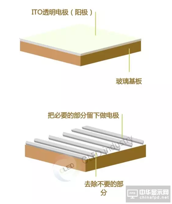 首先(xian),對購(gou)買的(de)(de)(de)(de)(de)ITO基板進行電極(ji)的(de)(de)(de)(de)(de)圖案化(hua),ITO作(zuo)為(wei)(wei)陽極(ji)嗎(ma),與之后沉積的(de)(de)(de)(de)(de)陰(yin)極(ji)形成“圍棋盤”的(de)(de)(de)(de)(de)形狀,電壓施加(jia)在它們(men)的(de)(de)(de)(de)(de)交叉部分(fen)(fen),這通過將(jiang)ITO薄膜不需(xu)要的(de)(de)(de)(de)(de)部分(fen)(fen)去除來(lai)實現(xian),這樣(yang)的(de)(de)(de)(de)(de)過程稱為(wei)(wei)圖案化(hua)。看下圖: