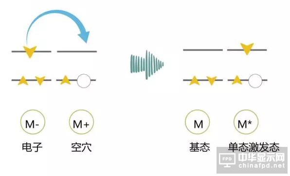 電(dian)子(zi)(zi)(zi)和空穴的(de)再(zai)結合(he),就是獲取電(dian)子(zi)(zi)(zi)的(de)分(fen)子(zi)(zi)(zi)和失去電(dian)子(zi)(zi)(zi)的(de)分(fen)子(zi)(zi)(zi)之間的(de)電(dian)子(zi)(zi)(zi)授(shou)受反應,反應后(hou)的(de)激(ji)發狀態下的(de)電(dian)子(zi)(zi)(zi)自旋方向相反的(de)時候,就是單(dan)態激(ji)發態,因為不(bu)穩定所以會降(jiang)回原來的(de)軌(gui)道,這時就發出熒光。